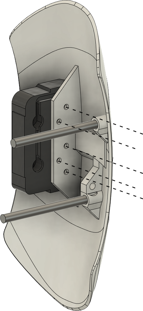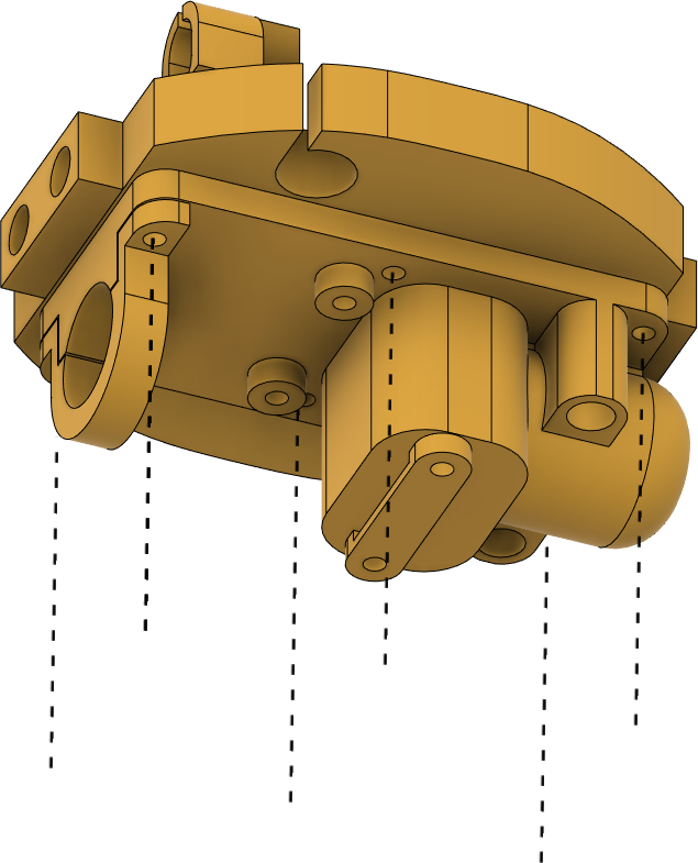 To help with print orientation, the base of the mechanics is done in 3 prints. Use 6 smalls crews to attach the parts together.