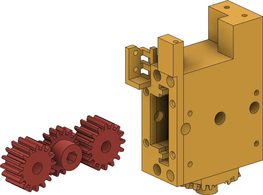 The 3 gears should slide right in. I've used an old allen key for the center axel. It should go in relatively easy, but the gear should get stuck on there. If it's too loose, the axel might slide out. The other two axels are 4mm rods cut to length. Make sure the gears are oriented the right way!