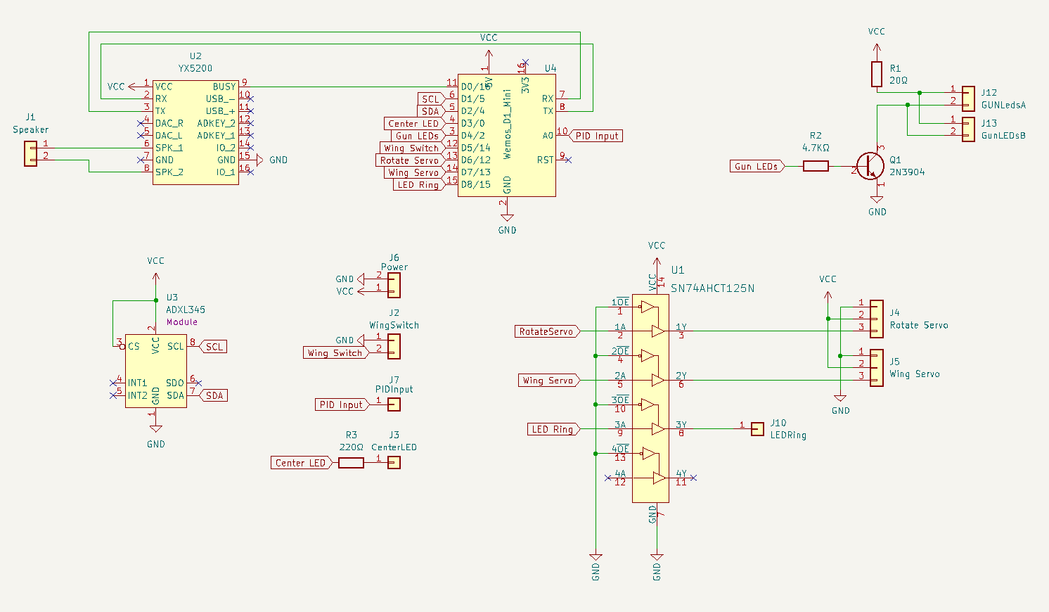 This is the schematic of the PCB. Note that not all components, like the LED ring, get their power from here. I've daisy-chained my 5V and Gnd lines from component to component.